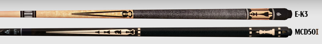 Inspired by the E-K3, the MCD50I elevates the classic chess motif with rich ebony and holly construction. The forearm points now feature four distinct pieces—the bishop, knight, rook, and pawn—balanced by king and queen inlays on the sleeve. With the addition of “Chessboard” index rings and a Defy shaft, this cue is a striking tribute to McDermott heritage.