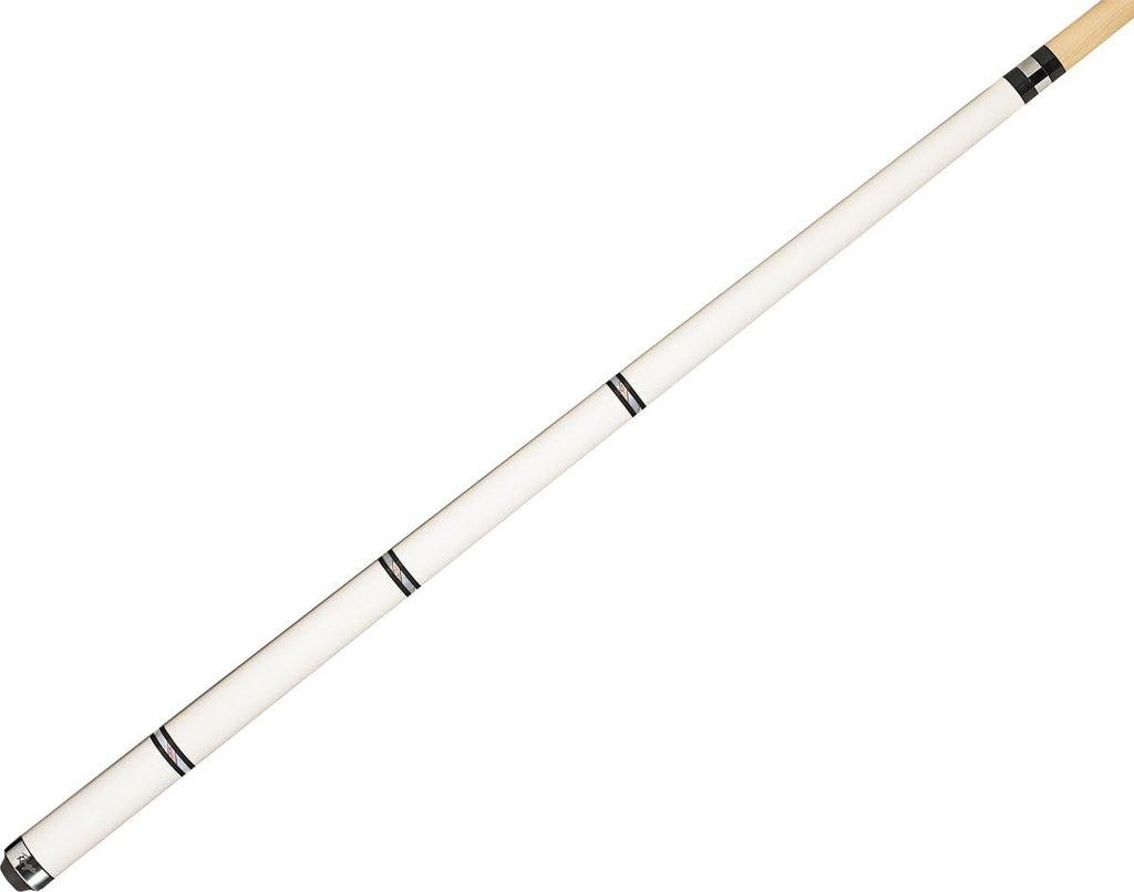 This sleek and simple Rage cue features 100% Hard Rock Maple construction with metallic white forearm and butt, decorative ring bands, Implex joint and sleek wrapless handle.