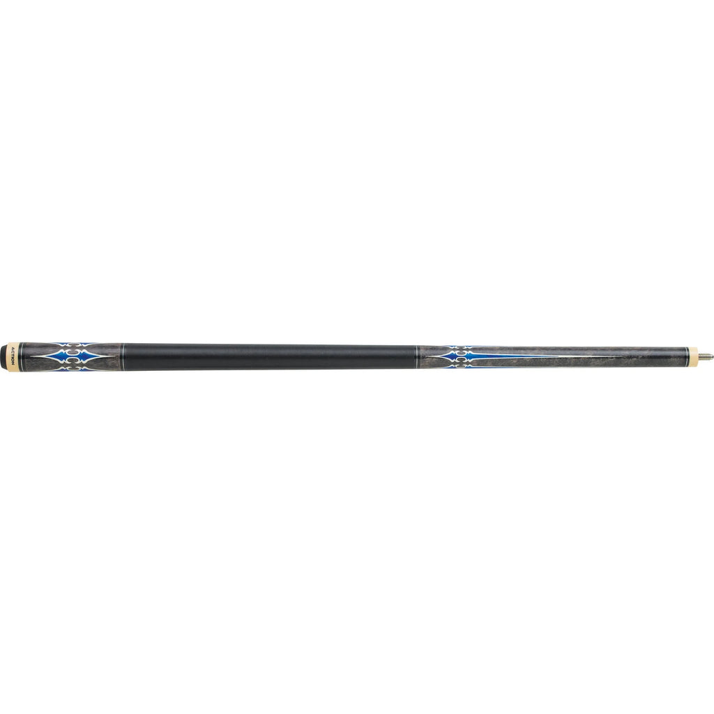 This cue from the Action Exotics line provides an elegant look with its dark gray stained Maple and floating white and marble blue decorative points. Feel secure in the playability of Action's cues with their solid wood-to-wood joints, fiber ferrules and top of the line layered, boar skin tips.