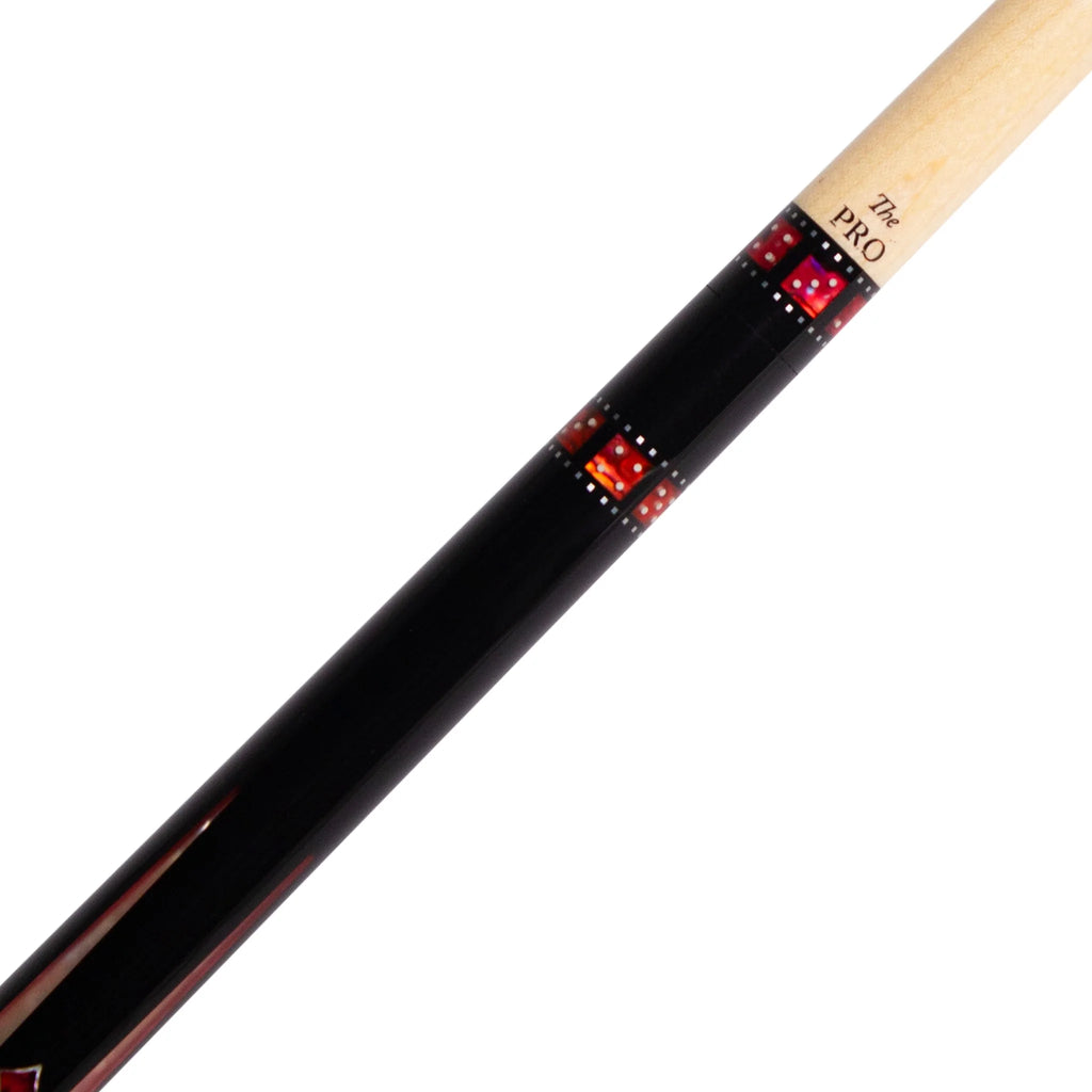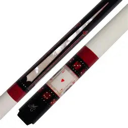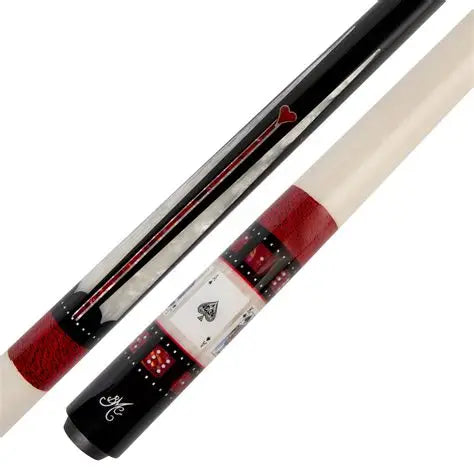 The BMC Casino 1 is a bold and eye-catching pool cue. It features an ebony-colored power piston forearm with four mother-of-pearl points, separated by four red paua shell lines. Its butt sleeve consists of a 4-card royal flush over a 48-piece Paua Shell sleeve, enhanced by red and white dice. The full design is completed by a matching shaft collar and joint.