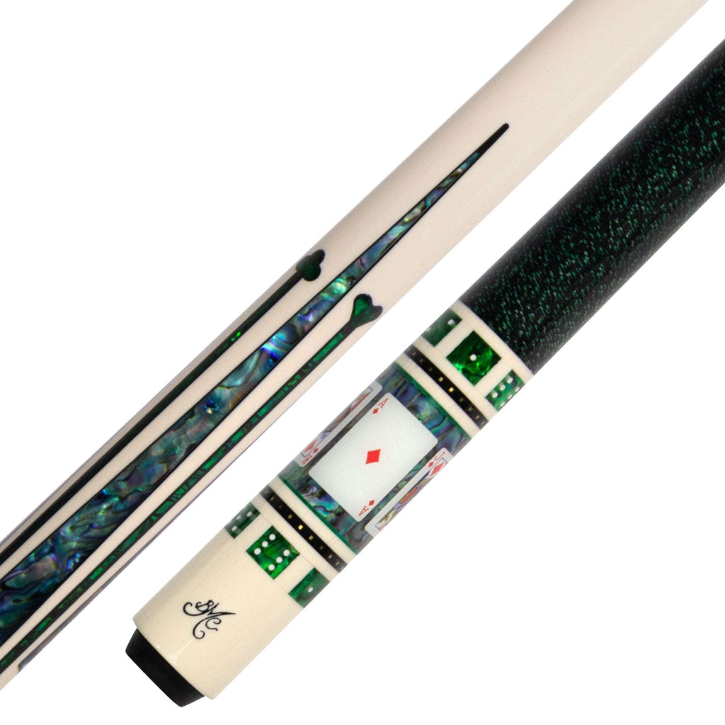 The BMC Casino 2 is a dynamic pool cue designed with top of the line features. Its card sleeve, imitation ivory power piston forearm, and 4 natural paua shell points embedded into a green cupped inlay, divided by 4 lines of black and natural paua shell, provide strength and a distinct look. Enjoy a superior playing experience with the BMC Casino 2.