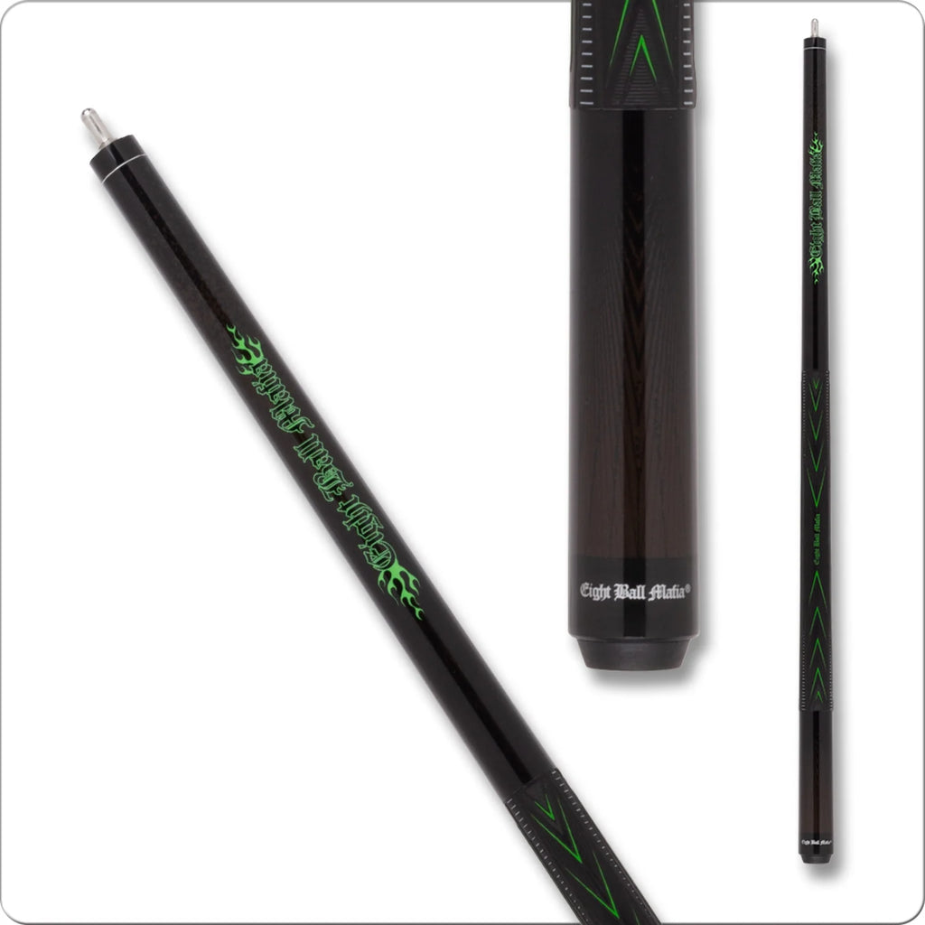 Forearm : Dark Brown/Black stained with lime green Eight Ball Mafia logo with flames