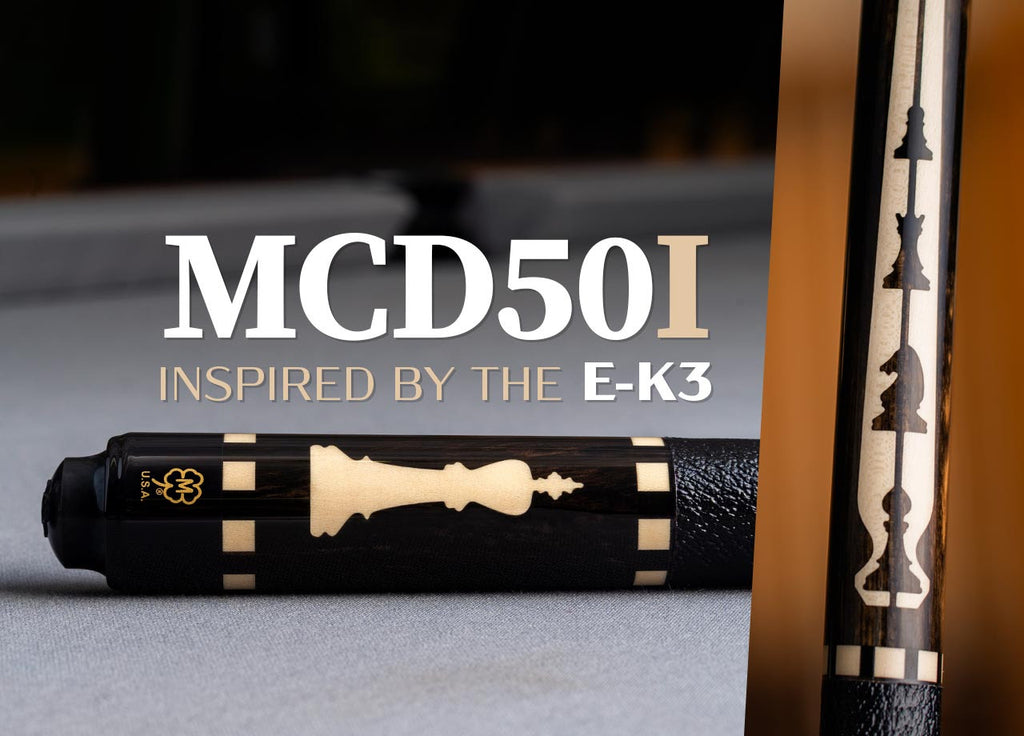 Inspired by the E-K3, the MCD50I elevates the classic chess motif with rich ebony and holly construction. The forearm points now feature four distinct pieces—the bishop, knight, rook, and pawn—balanced by king and queen inlays on the sleeve. With the addition of “Chessboard” index rings and a Defy shaft, this cue is a striking tribute to McDermott heritage.