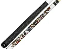 The D-LH Players Pool Cue features a white forearm with tattoo-inspired Live Hard Hustle Hard design and a black-end loaded rubberized grip with skull Mz Multi-Zone traction pattern, stainless steal joint collar and black slimline butt cap.