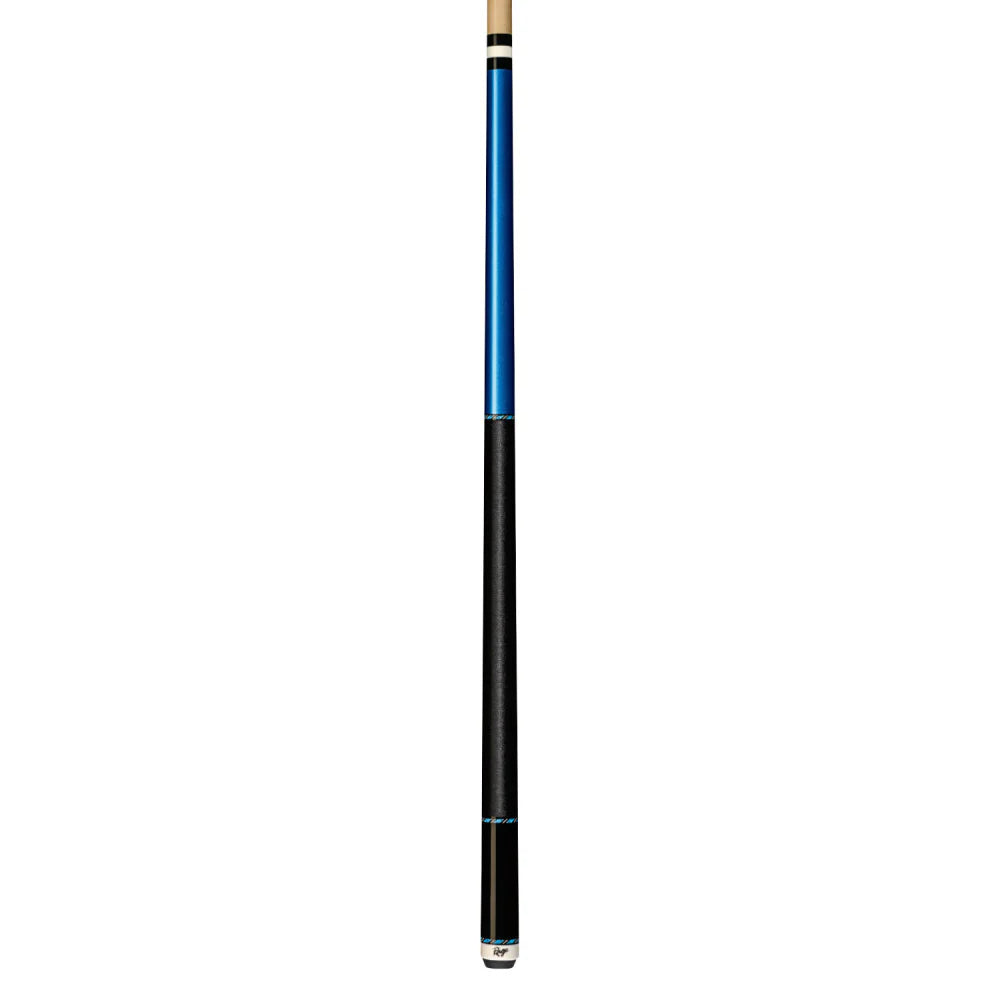 This modern traditional Rage cue features 100% Hard Rock Maple construction with Blue Metallic Paint forearm w/ Blue Recon graphic rings, Implex joint and solid black pressed nylon wrap.
