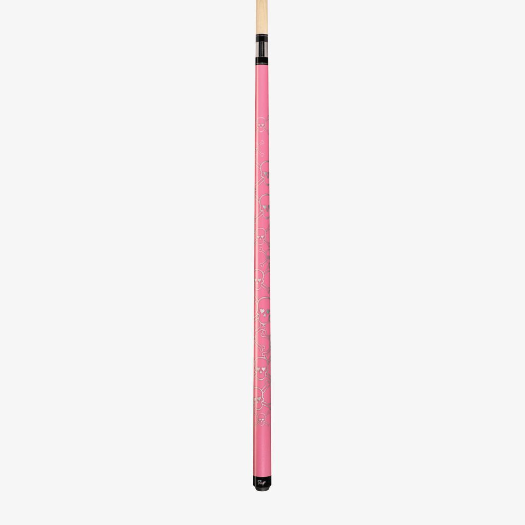 This bold and modern Rage cue features 100% Hard Rock Maple construction with metallic cotton candy pink forearm and butt, graphic silver skull design, Implex joint and sleek wrapless handle.