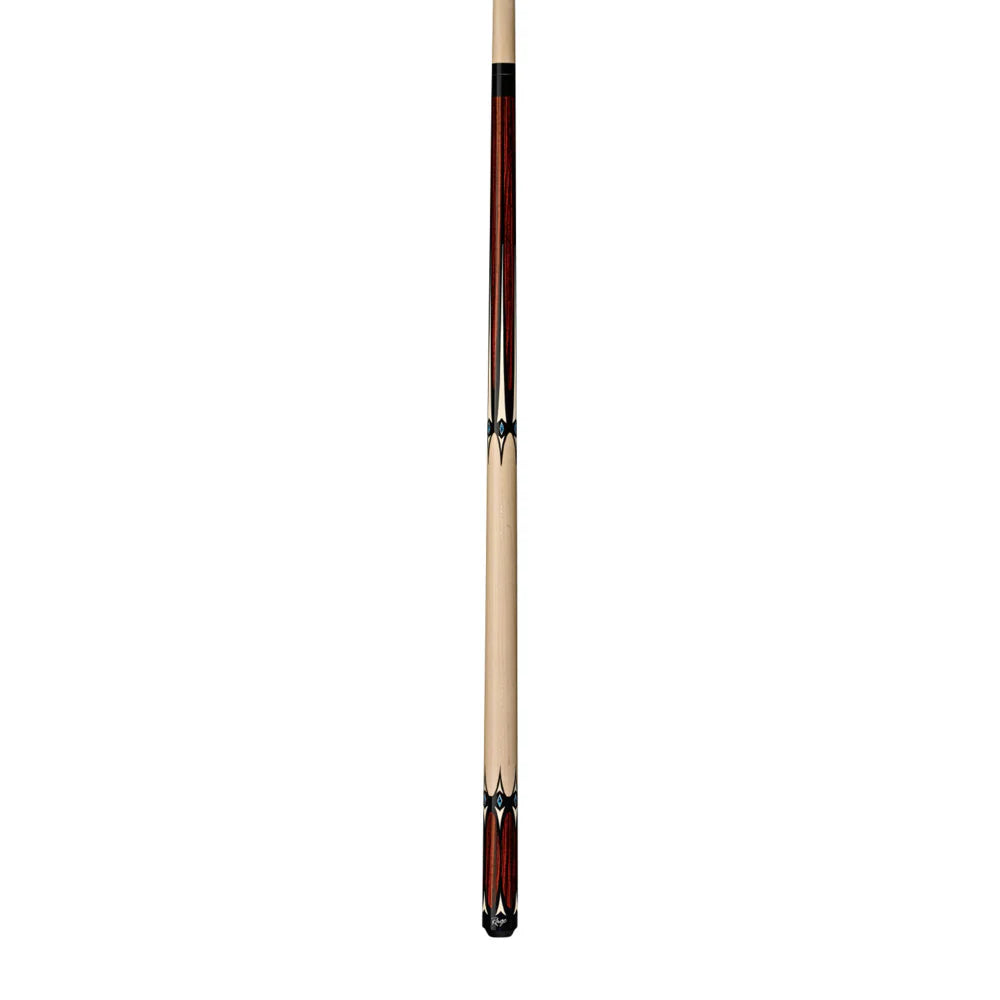 This modern traditional Rage cue features 100% Hard Rock Maple construction with graphic cocobolo forearm and butt, graphic black and white points with blue diamond accents, Implex joint and sleek wrapless handle